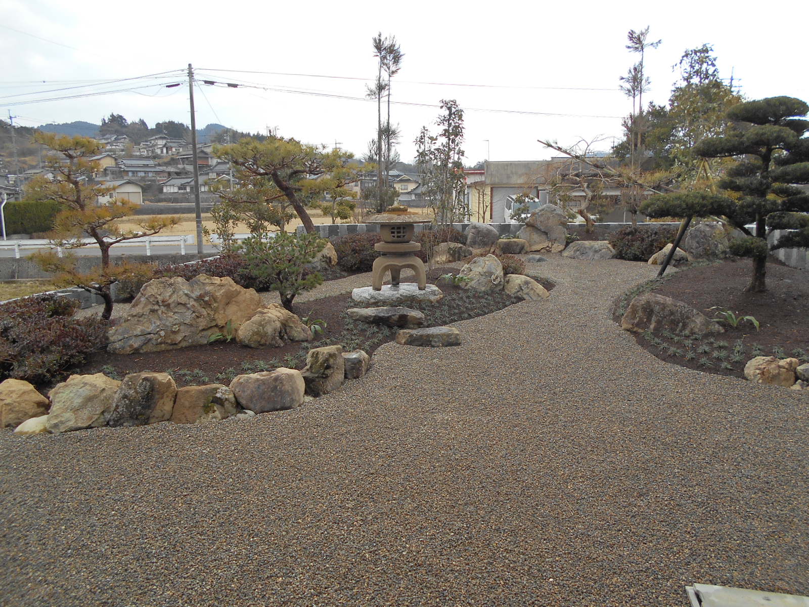河ジャミを敷き、水の流れを表現した枯山水の庭が仕上がった。