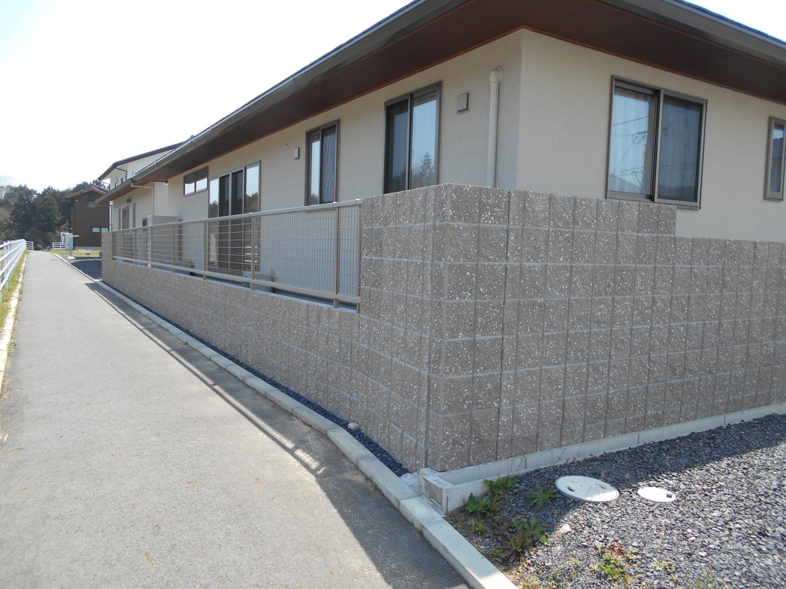 敷地外周はリブスプリットのブロック積、一部縦格子の形材フェンス仕上とした。