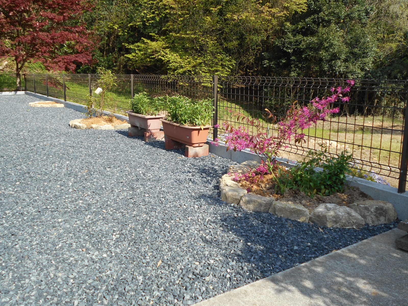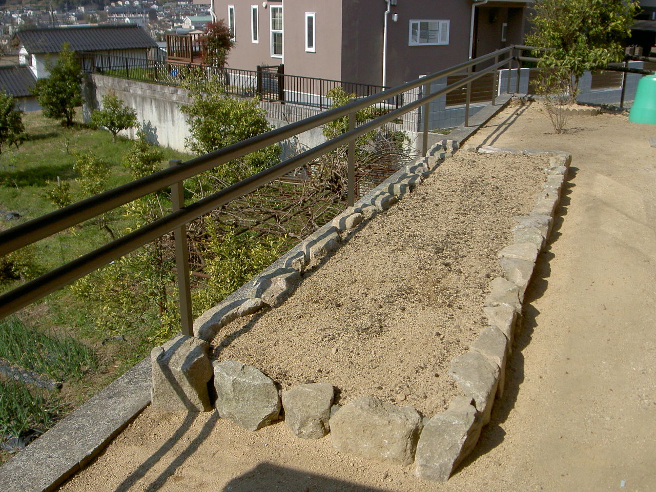 外周は、形材簡易フェンス。自然石縁石の内側に改良土を入れ、家庭菜園兼花壇として使用できるスペースを設けた。