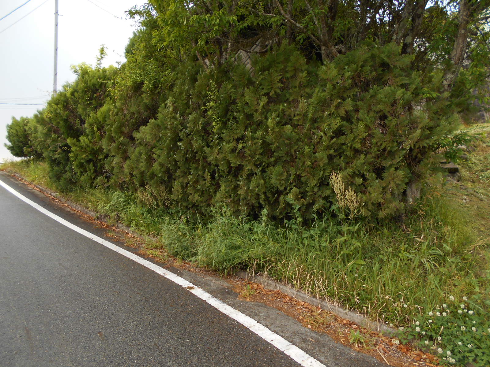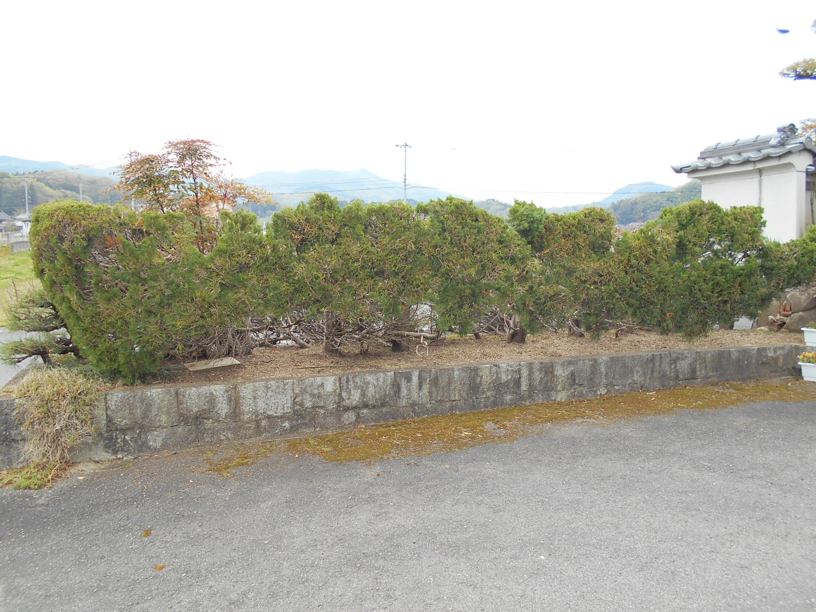 施工前の状況。カイズカイブキの生垣が大きくなりすぎて、上部を切ったものの景観が悪いので、新たにやり替える計画。
