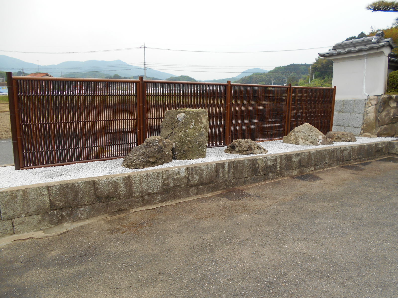 完全目隠しではないが、風通しが効き尚且つ趣のある、すす竹大津垣とし、手前には景石でさざれ石を配置、白川砂敷とした。