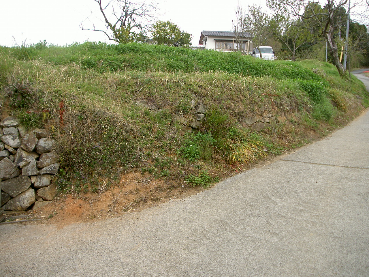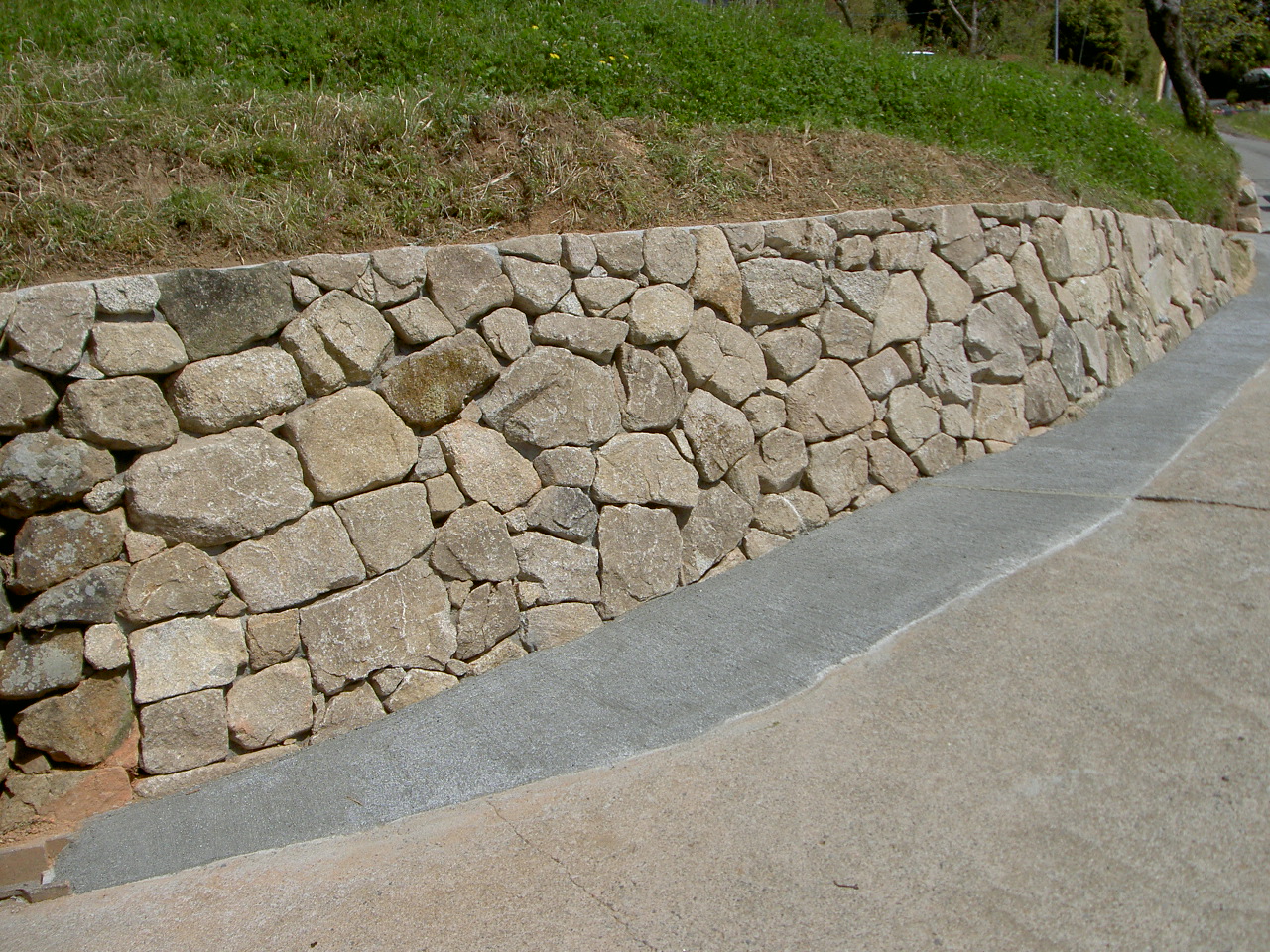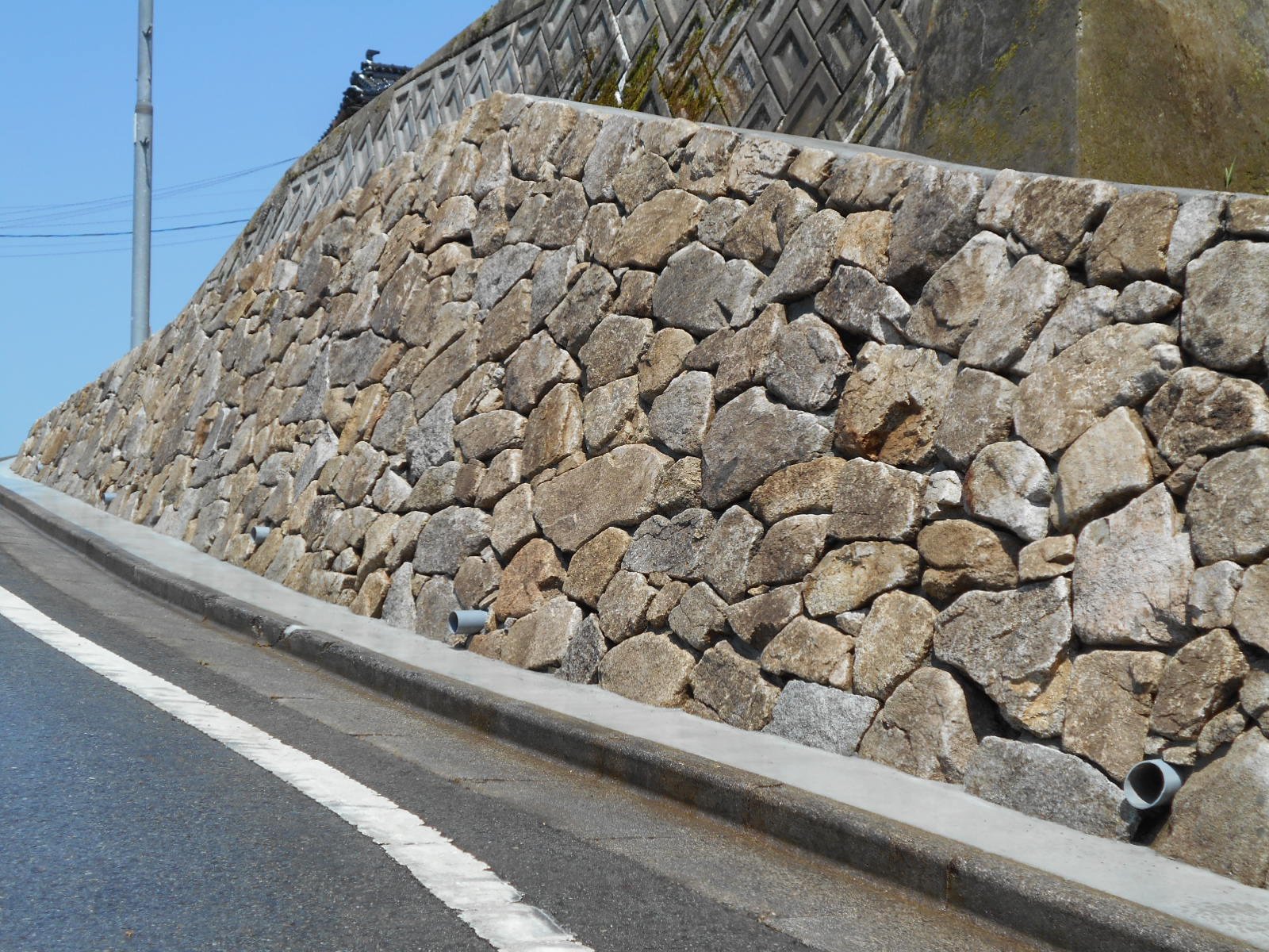施工完了の状況。自然石(御影石)による野面石積で施工。コンクリートブロックと違い、周りの景観と馴染み易い。年月が経つにつれ、より一層馴染む。また、法面の草刈作業も軽減される。