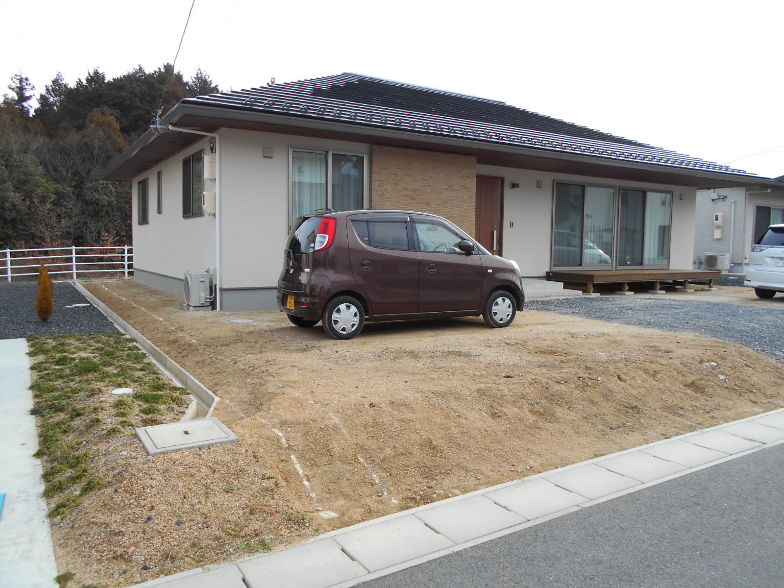 カーポート(左端)とは別に、駐車スペースを道路側に縦列駐車できる様に確保。庭との間には、割肌の石材を土留めを兼ねて据付けた。植栽は、アラカシ株立・エゴノキ株立・ソヨゴ株立・ミツバツツジ・コウライシバ他。