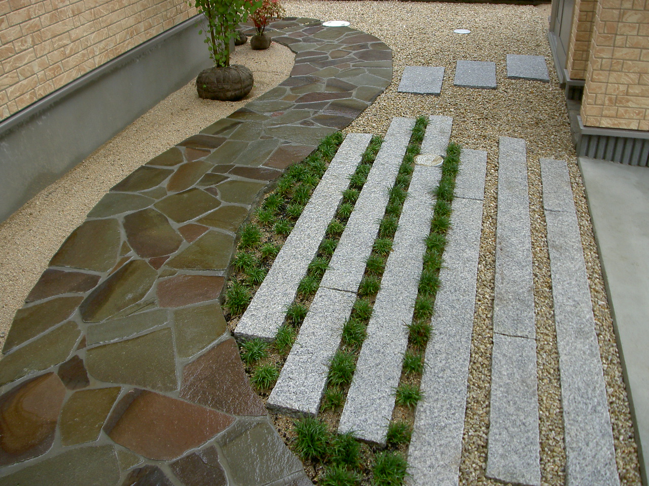 ジャワ鉄平石張と切石(延石・板石)の組合せによる通路。曲線と直線、下草の緑が全体を引き立たせるかたちとなった。